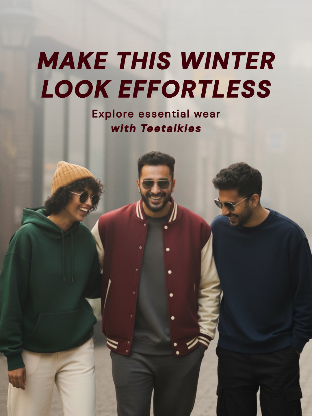 If you’re after minimal, comfortable, and long-lasting winter wear, Teetalkies is one of the best choices in India. We design essentials like hoodies, sweatshirts, and jackets using quality fabrics that stay soft and durable even after multiple washes. Plus, our color-rich collection makes it easy to find your perfect winter shade.